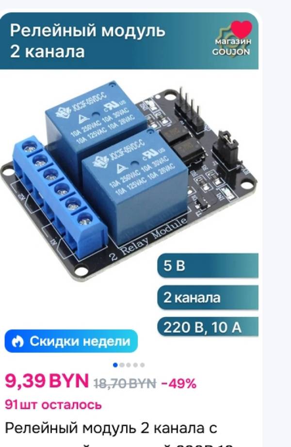 2. Модуль реле Ардуино, 2 канала, 220В 10А 12р